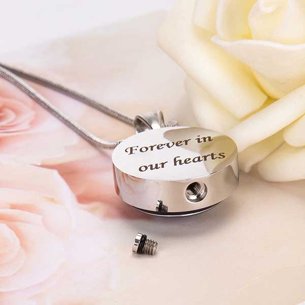 Engraved Ashes Necklaces Material: This pet ashes necklace is made of high quality stainless steel; pendant &chain will never rust, corrode, rust or stain. Anti-perspiration, waterproof, durable, fadeless.It's a perfect memorial keepsake for dog ashes or cat ashes.