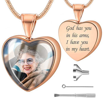 This Personalized Heart Necklace Urns for Human Ashes can be customized with the photo of your lost loved one or pet and the engraved words such as names, special dates,etc. Take the memories of your loved one with you no matter where you go by wearing this ashes necklace.