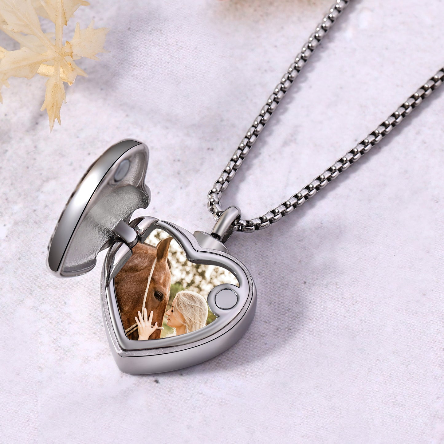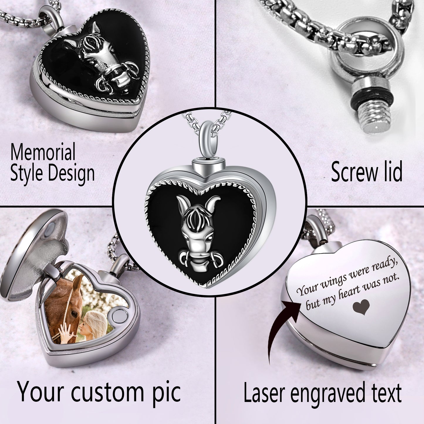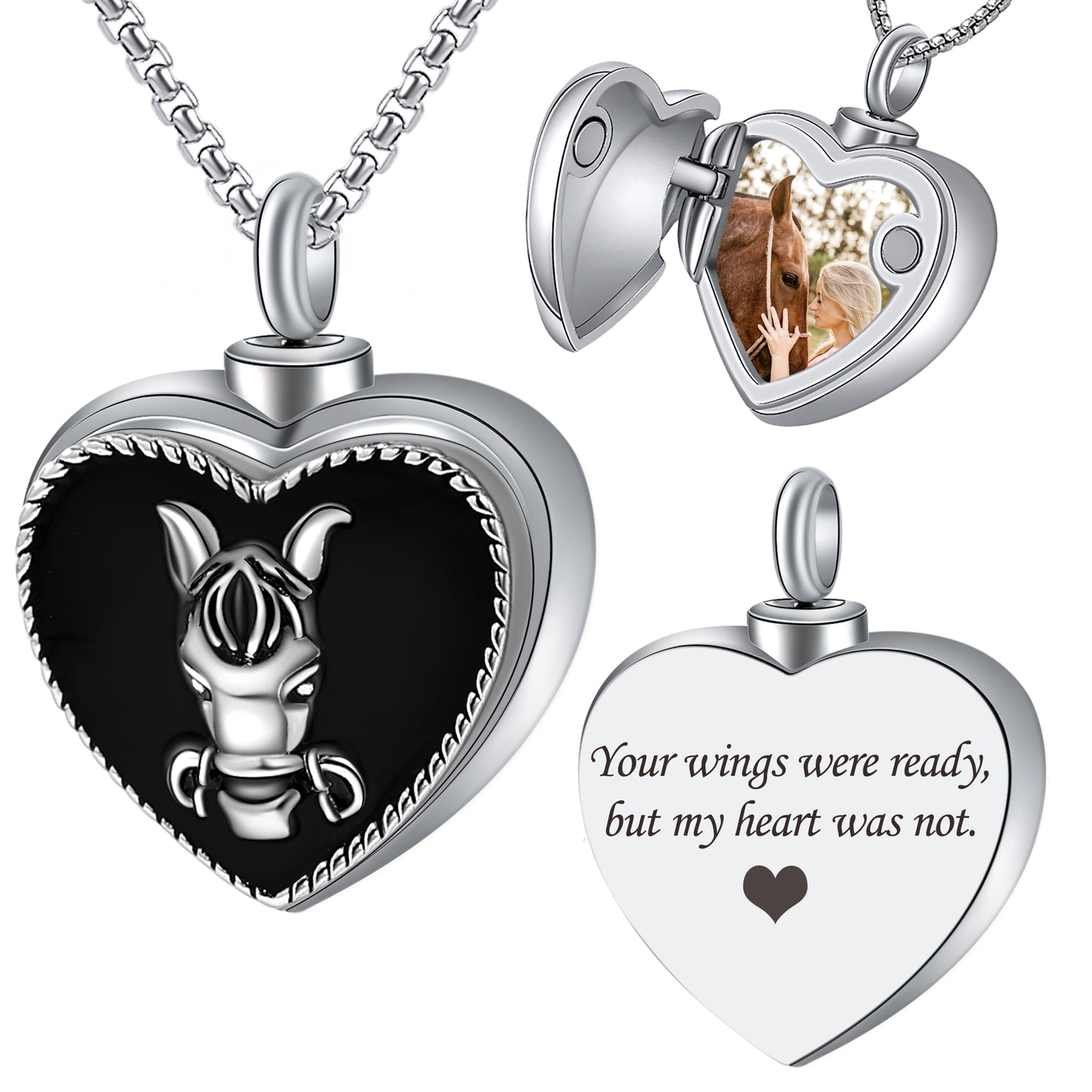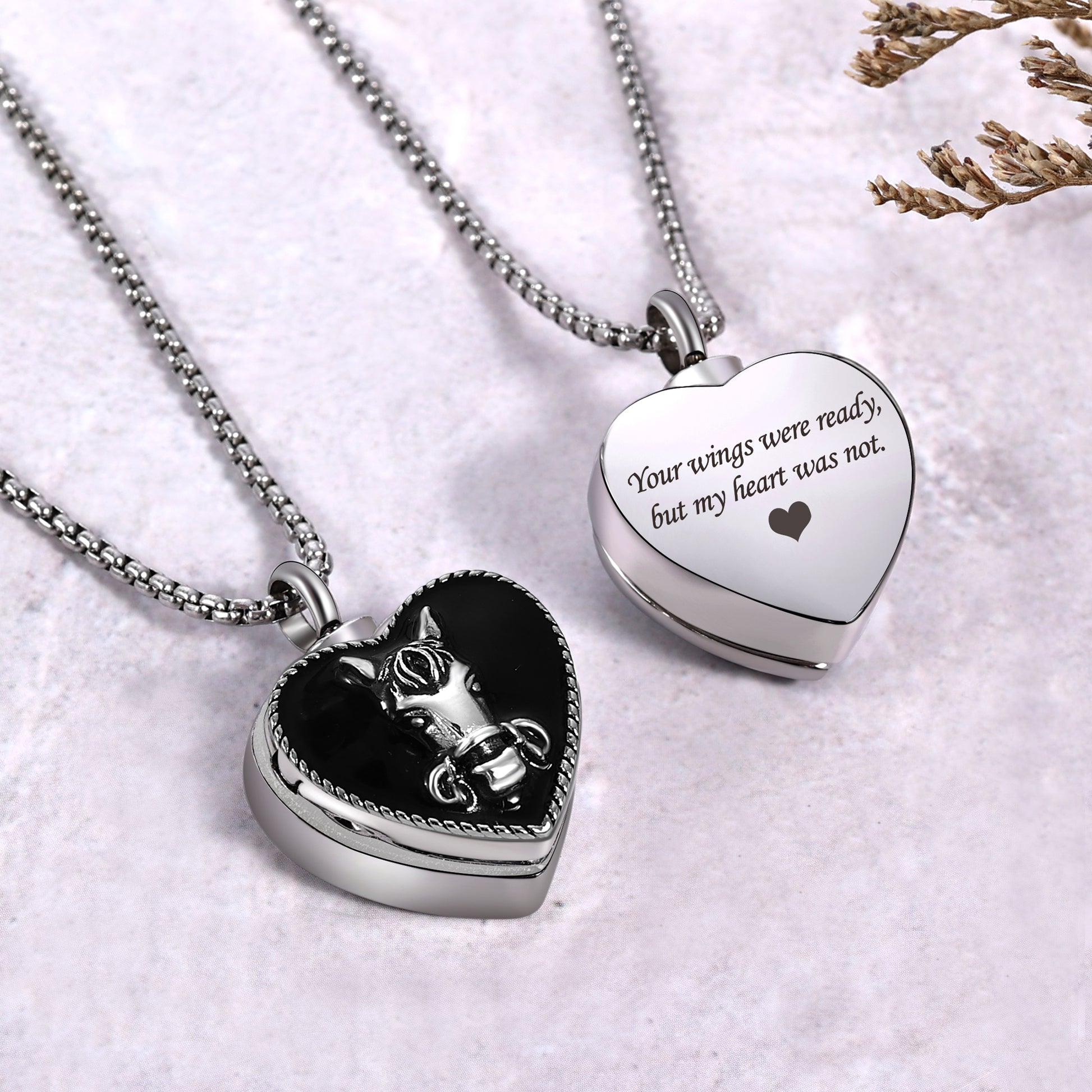 Crafted with care and compassion, our heart-shaped locket serves as a cherished keepsake to hold close the memories of those who have passed. The intricate horse pattern adorning its surface symbolizes strength, grace, and the enduring spirit of the ones we hold dear in our hearts.