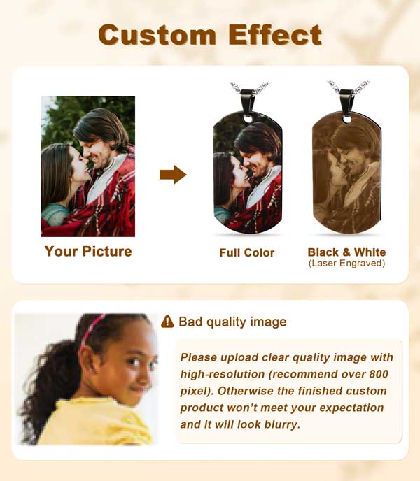 Upload the photos with high resolution and confirm the effect of your personalized jewelry before submitting the order.