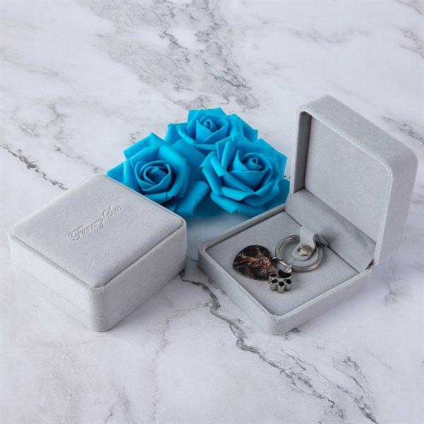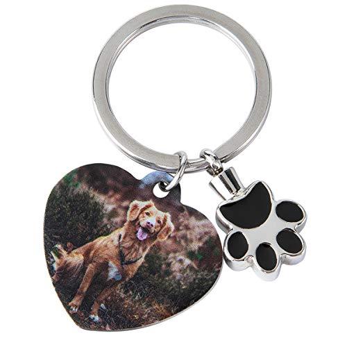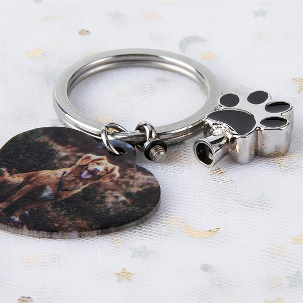 The central piece of our design is a beautifully crafted heart keychain, symbolizing the love and joy your pet brings into your life. Make your keychain truly one-of-a-kind by personalizing it with a photo of your cherished pet and adding a personalized text such as your pet's name, a special date, or a heartful message. This personalized urn keychain features a paw print urn component used to preserve the cremated ashes. This customization option allows you to make the keychain uniquely yours.